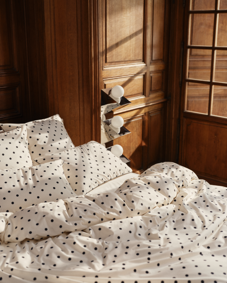 Centraal in de collectie staat beddengoed met grafische patronen. Zo gebruikt Bonsoirs onder meer het zogenoemde ‘pas de coq’-motief, een klassiek patroon dat ook uit de modewereld bekend is en bestaat uit kleine, herhalende vormen. Daarnaast introduceert het merk een dekbedovertrek met een stippenpatroon: zwarte stippen op een crèmekleurige achtergrond, afgewerkt met een contrasterende rand. Ook nieuw in de collectie is een dekbed met een vulling van ganzendons. Volgens het bedrijf zorgt dat materiaal voor goede isolatie terwijl het dekbed relatief licht blijft. De buitenstof is gemaakt van katoensatijn dat wordt geproduceerd door een Franse textielleverancier. Het slaapkamerconcept wordt verder uitgebreid met badlinnen onder de naam ‘Équilibre’. Daarmee wil Bonsoirs dezelfde materialen en kleuren uit de slaapkamer ook in de badkamer laten terugkomen, zodat verschillende ruimtes in huis beter op elkaar aansluiten.