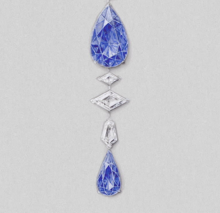 Ook kleur wordt functioneel ingezet. In een ontwerp waarin chrysopraas, spinellen, turkoois en diamant samenkomen, bepalen de stenen niet alleen het uiterlijk, maar ook de verdeling van het gewicht en de bewegelijkheid van het sieraad. Het resultaat is een ketting die soepel valt en meebeweegt met het lichaam, zonder dat delen gaan trekken of kantelen.