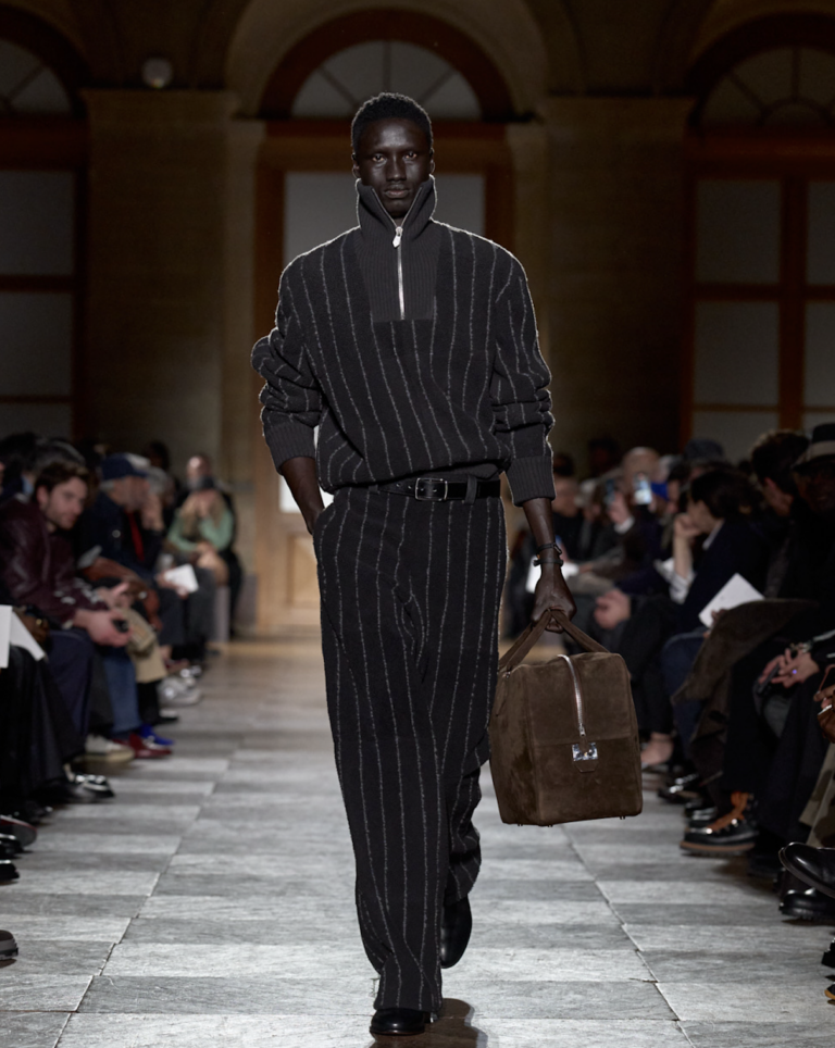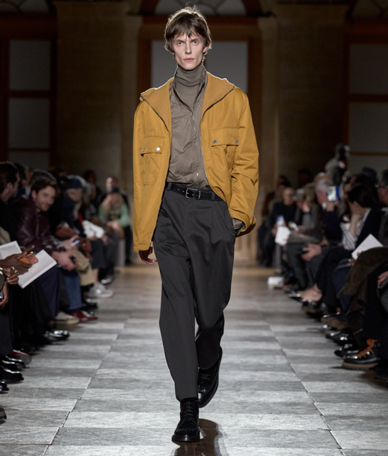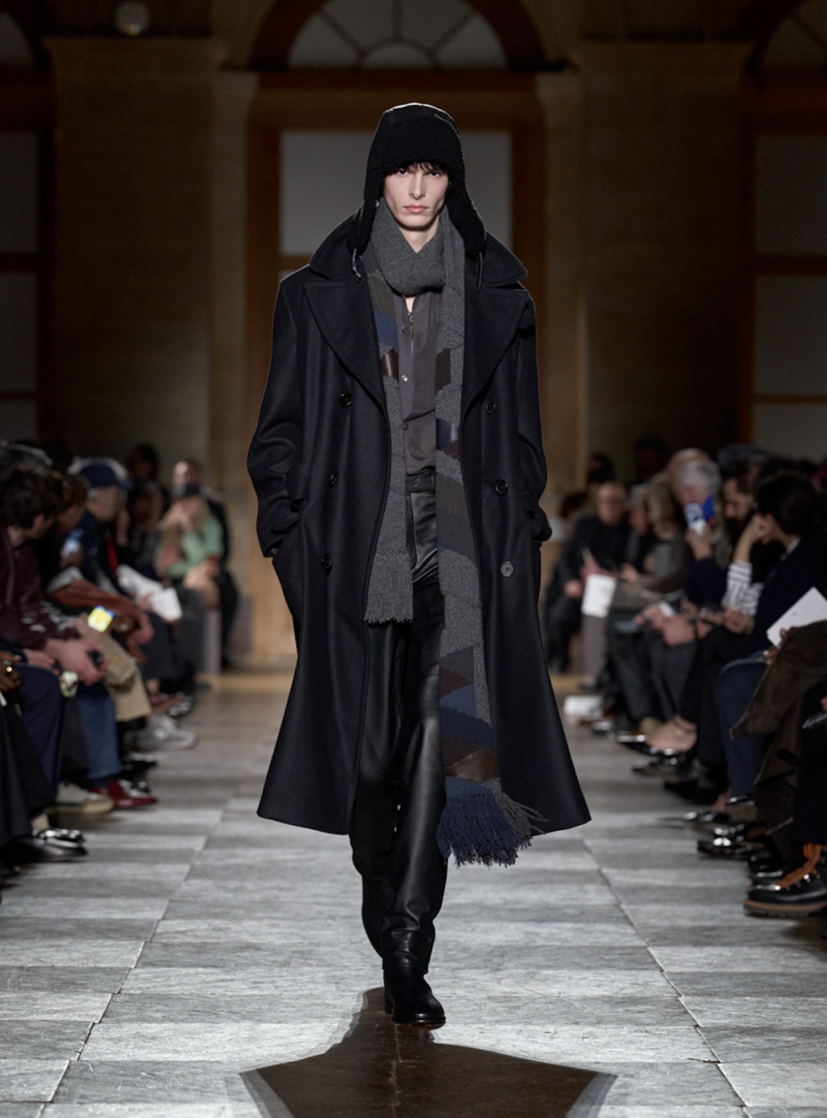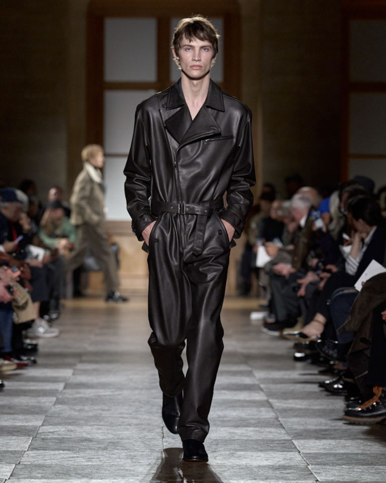De collectie was kenmerkend voor Nichanians aanpak: ingetogen, precies en gericht op draagbaarheid. Geen uitgesproken trends of theatrale ingrepen, maar zorgvuldig gesneden jassen, broeken en mantels die voortbouwen op klassieke herenkleding. Mantels van wol en kasjmier waren strak geconstrueerd, leren broeken en jacks benadrukten materiaal en afwerking, terwijl dubbelrijige krijtstreeppakken verwijzingen maakten naar traditioneel maatwerk.