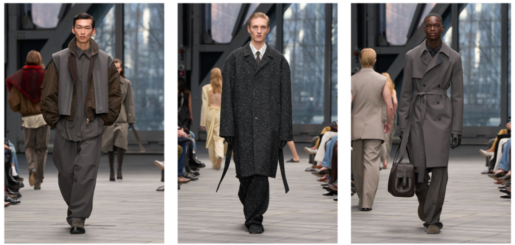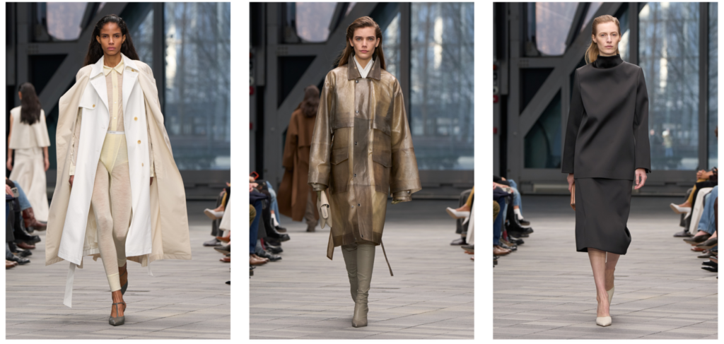 Die benadering is zichtbaar in de opbouw van de collectie. Leoni werkt met een compacte garderobe van maatpakken, trenchcoats, blousons, lange jassen en jurken. Silhouetten zijn lang en recht, vaak strak langs het lichaam gesneden. Details blijven functioneel: open ruggen, mouwloze constructies en zichtbare naden leggen de nadruk op hoe een kledingstuk is gemaakt, niet op decoratie.