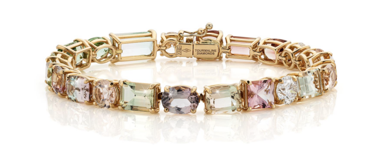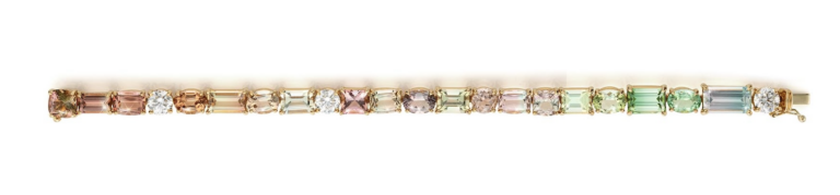 Ook de Bi-color Tourmaline Tennis Bracelet Optical Illusion volgt die aanpak. De armband is gebaseerd op het klassieke tennisarmband-model, maar technisch opnieuw opgebouwd. Het sieraad is uitgevoerd in 18 karaat warm geelgoud en gezet met 28,25 karaat mix-cut bi-color toermalijnen en 3,00 karaat briljant geslepen natuurlijke witte diamanten. De afwisseling van slijpvormen en kleurzones zorgt voor een strak ritme, waarbij de zetting het beeld bepaalt.