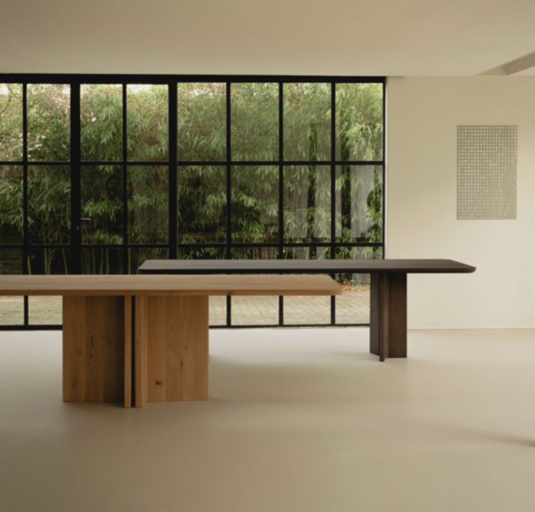 De collectie draait om twee nieuw ontworpen onderstellen: het solo-onderstel en het duo-onderstel. Deze vormen de constructieve én visuele basis van de tafels.Het solo-onderstel bestaat uit twee eikenhouten delen. De centrale staander heeft een T-vorm met een stompe hoek die het blad draagt. Doordat hetzelfde eikenhout wordt gebruikt als bij de bestaande tafelbladen, sluit het ontwerp technisch aan op de huidige collectie. Het duo-onderstel is opgebouwd uit twee T-vormige elementen die dicht tegen elkaar zijn geplaatst en samen één centrale drager vormen. Die opstelling zorgt voor stabiliteit en een evenwichtige verdeling van het gewicht. Beide onderstellen kunnen worden gecombineerd met verschillende eikenhouten en Fenix bladen, wat leidt tot meerdere tafeluitvoeringen binnen dezelfde serie.