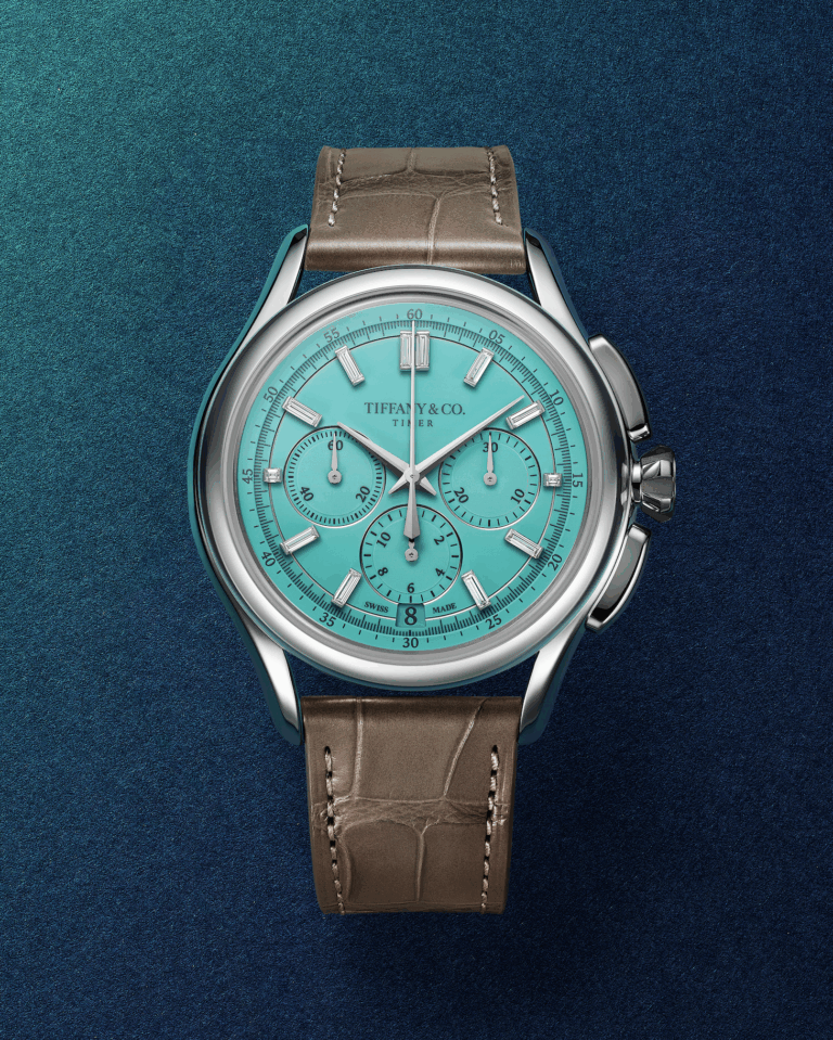Die geschiedenis vormt het uitgangspunt van de nieuwe Tiffany Timer. Het horloge heeft een 40 millimeter platina kast en een wijzerplaat in het kenmerkende Tiffany Blue®. De uurmarkeringen bestaan uit baguette-geslepen diamanten, een verwijzing naar Tiffany’s expertise in edelsteenzetting. De kroon is geïnspireerd op de iconische zes-poots Tiffany Setting, bekend van de solitaire diamanten ringen van het huis.