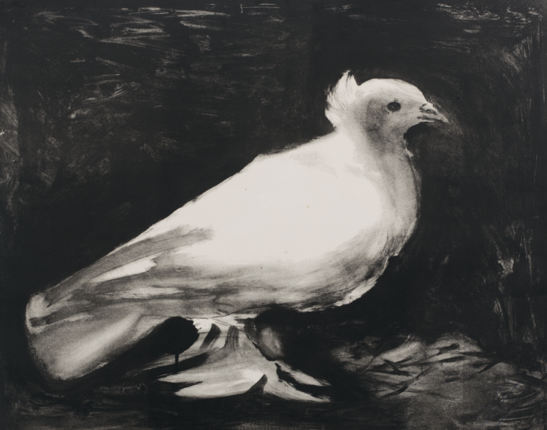FOTOGRAFIE: Links (voor mobiel: bovenaan) – Iris van Herpen, Idolomantis, Roots of Rebirth-collectie, look 17, 2021. Duchess-stof, organza, mylar-folie, katoen. Atelier Iris van Herpen, Amsterdam | Bovenaan (voor mobiel: daaronder) – Arie de Vois, Zelfportret als jager, ca. 1660. Mauritshuis, Den Haag | Pablo Picasso, La colombe (De duif), 1949. Kunstmuseum Picasso Museum – Die Sammlung Huizinga, Münster | Carel Fabritius, Het puttertje, 1654. Mauritshuis, Den Haag